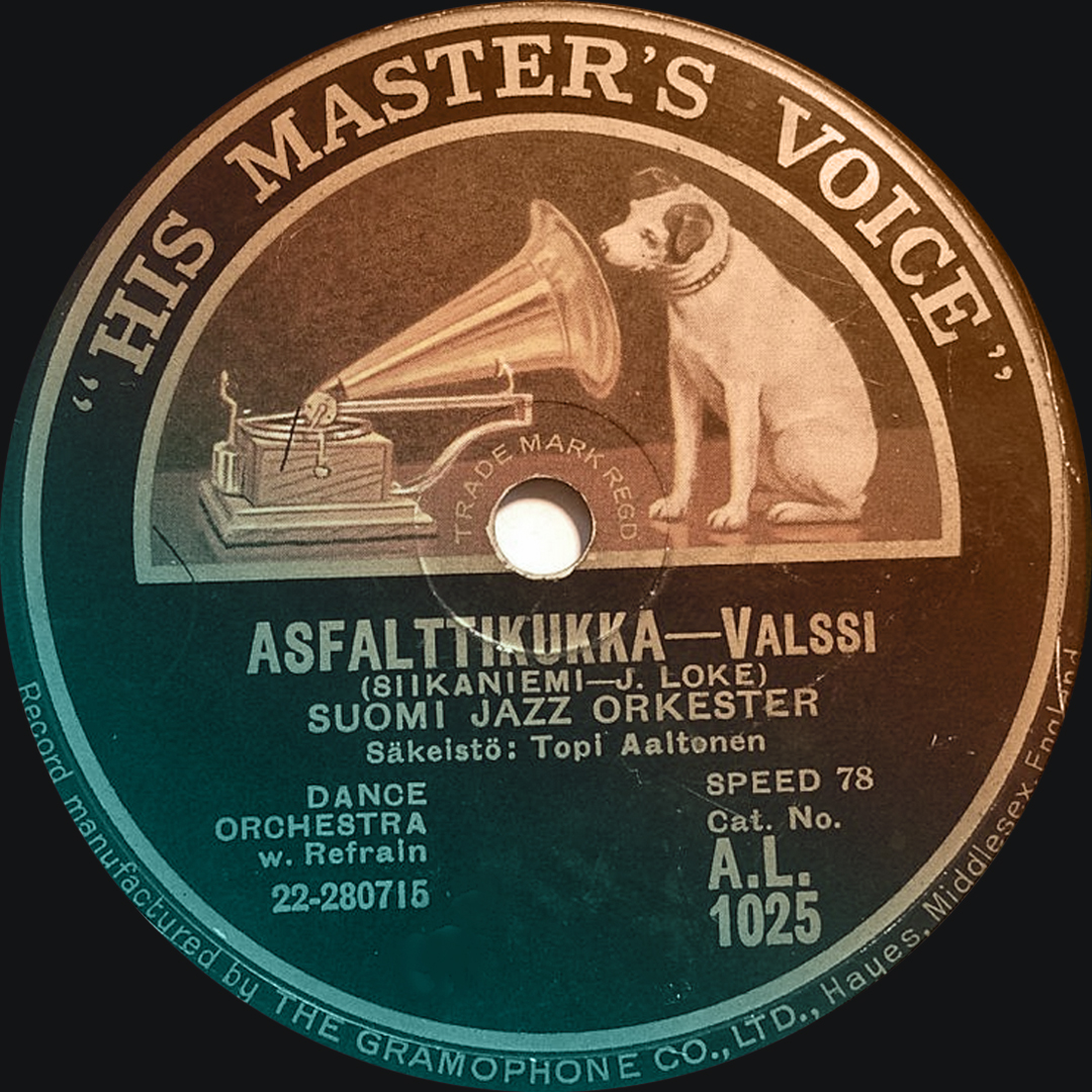 "description": "Asfalttikukka, valssi (Laulu kaupungin, yllä asfaltin -)\nSäveltäjä Jonny Loke (Ernest Pingoud). Sanat Väinö Siikaniemi.\nEsittäjät Topi Aaltonen (Ture Ara) & Suomi Jazz Orkesteri.\nHMV. Äänitetty Helsingissä 25. toukokuuta 1929.",