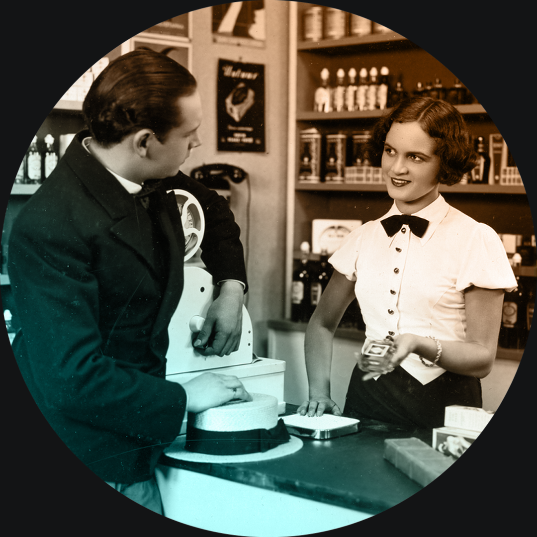 På bilden Kaarlo Angerkoski och Martta Kontula i filmen Pikku myyjätär (Den lilla försäljerskan) där en musikstuderande förälskar sig i en försäljare. Kortkomedin var en beställning av Havin Osakeyhtiö för marknadsföra bolagets produkter. Elonet. Card JSON{
