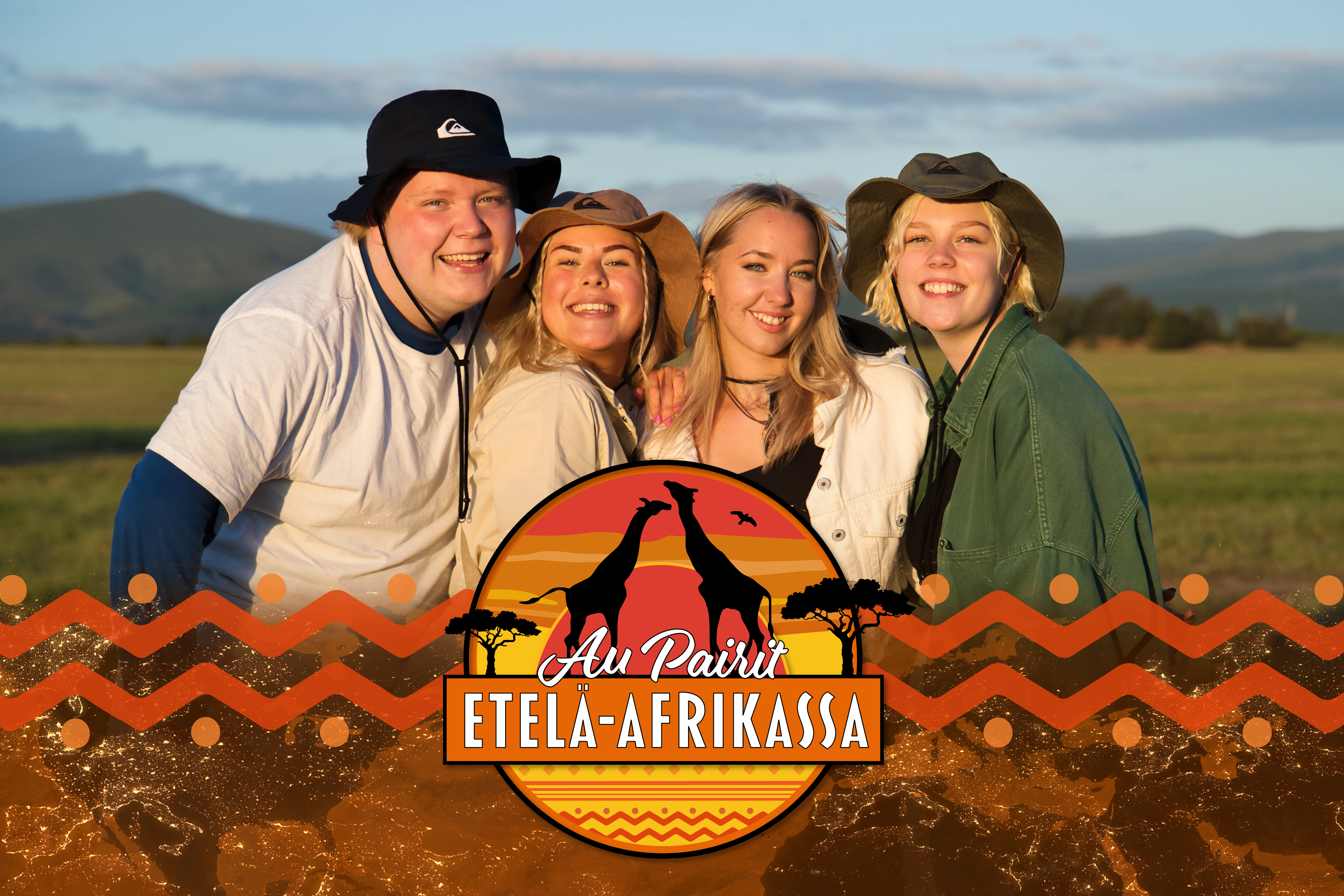 "description": "Säntillinen Aada, kupliva sinkku Emmi-Lotta, suorasanainen Sebastian ja urheilullinen Emilia pakkaavat matkalaukut ja lähtevät toiselle puolelle maapalloa, Etelä-Afrikkaan. Läheisten ja kaiken tutun hyvästely tekee tiukkaa. Entä kuinka sujuu au pair -nelikon ensikohtaaminen?",