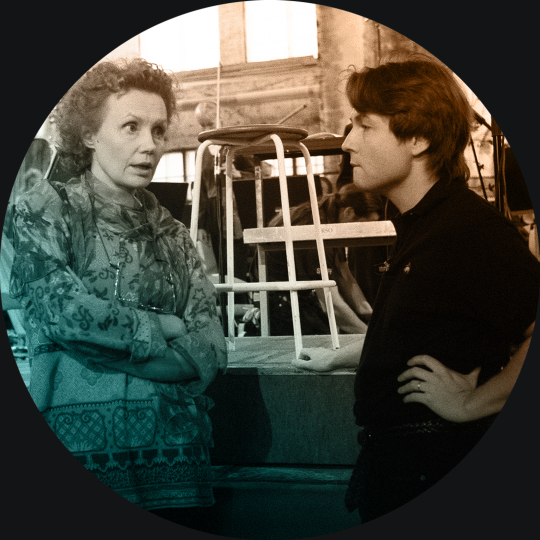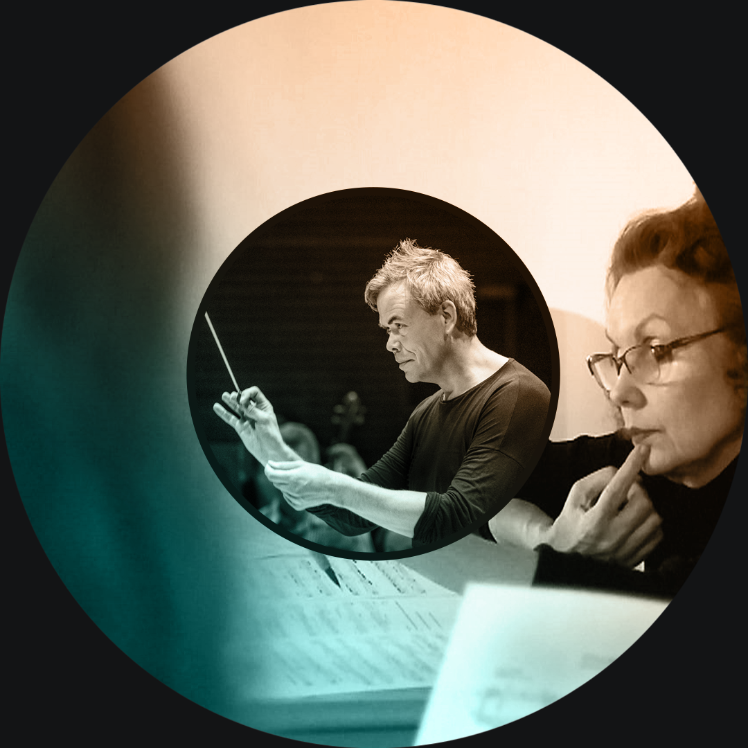 Kuvassa oikealla Kaija Saariaho ja vasemmalla Hannu Lintu Yleisradion televisio-ohjelmassa Klassinen Suomi 2016. Yleisradio. Video still.