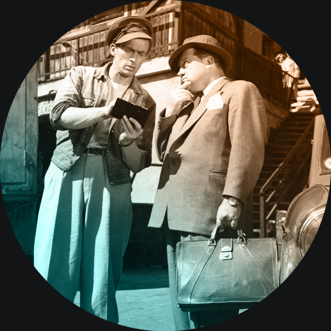 Kuvassa tullietsivä Tapio (Tapio Rautavaara) ja salakuljetusliigan apulaispomo (Ossi Elstelä) elokuvassa Salakuljettajan laulu vuodelta 1952, johon George de Godzinsky sävelsi musiikin. Lasse Pöystin ohjaama elokuva kertoo sodanjälkeisen ajan elintarvikesäännöstelystä ja siihen liittyvästä salakuljetuksesta. Tullietsivä Tapio soluttautuu salakuljettajien liigaan, joka toimii ohjelmakiertueen varjolla. Musiikkiesitysten ja etsiväntöiden lomassa Tapio tutustuu myös tanssijatar Leilaan (Assi Nortia). Elonet.