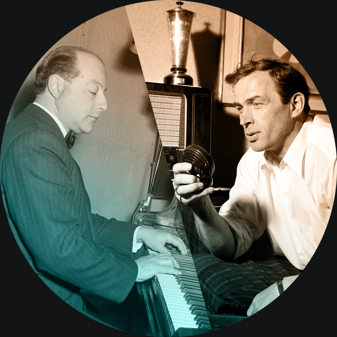 Card Description: George de Godzinskyn ja Tapio Rautavaaran yhteistyö äänitystudiossa alkoi kesällä 1949, kun Rautavaara, Georg Malmstén ja sopraano Malmi Vilppula äänittivät Yleisradiolle sikermän Godzinskyn sovittamia J. Alfred Tannerin (1884–1927) kupletteja otsikolla "Minä laulajapoika olen maailman rannan".