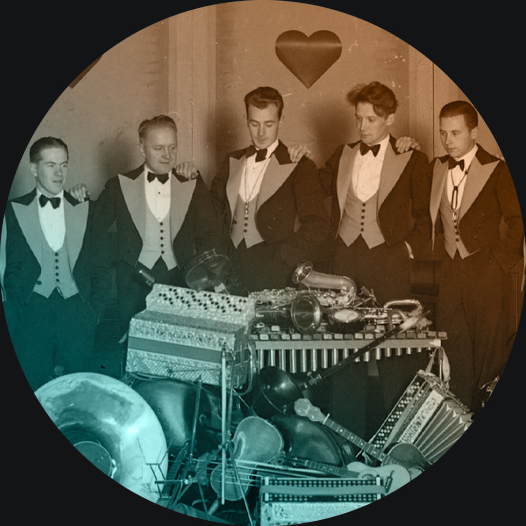 Kuvassa Dallapén soittajia 1930-luvulla vas. trumpetisti Allu Kosonen, viulisti Helge Pahlman ja harmonikkamestari Viljo Vesterinen. Takana rumpali Jomi Leino. Kuva Yleisradio.