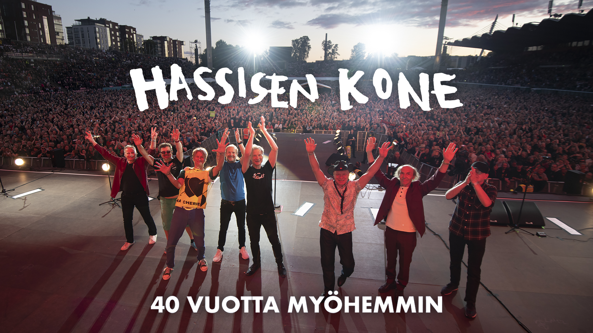 Header Card Description: Hassisen Kone laulatti yleisöä yli sukupolvien paluukeikallaan 40 vuotta hajoamisensa jälkeen Ratinan stadionilla Tampereella heinäkuussa 2022. Konserttikoosteessa kuullaan yhtyeen ikivihreitä kappaleita ja koossa ovat bändin perustajajäsenet sekä useita matkan varrella mukana soittaneita muusikkoja. Yli 30 000 yhtyeen haltioitunutta fania näki ja koki kauan odottamansa konsertin. Konsertin, jonka piti toteutua jo vuonna 2020 mutta jota oli jouduttu siirtämään kaksi kertaa koronapandemian vuoksi.