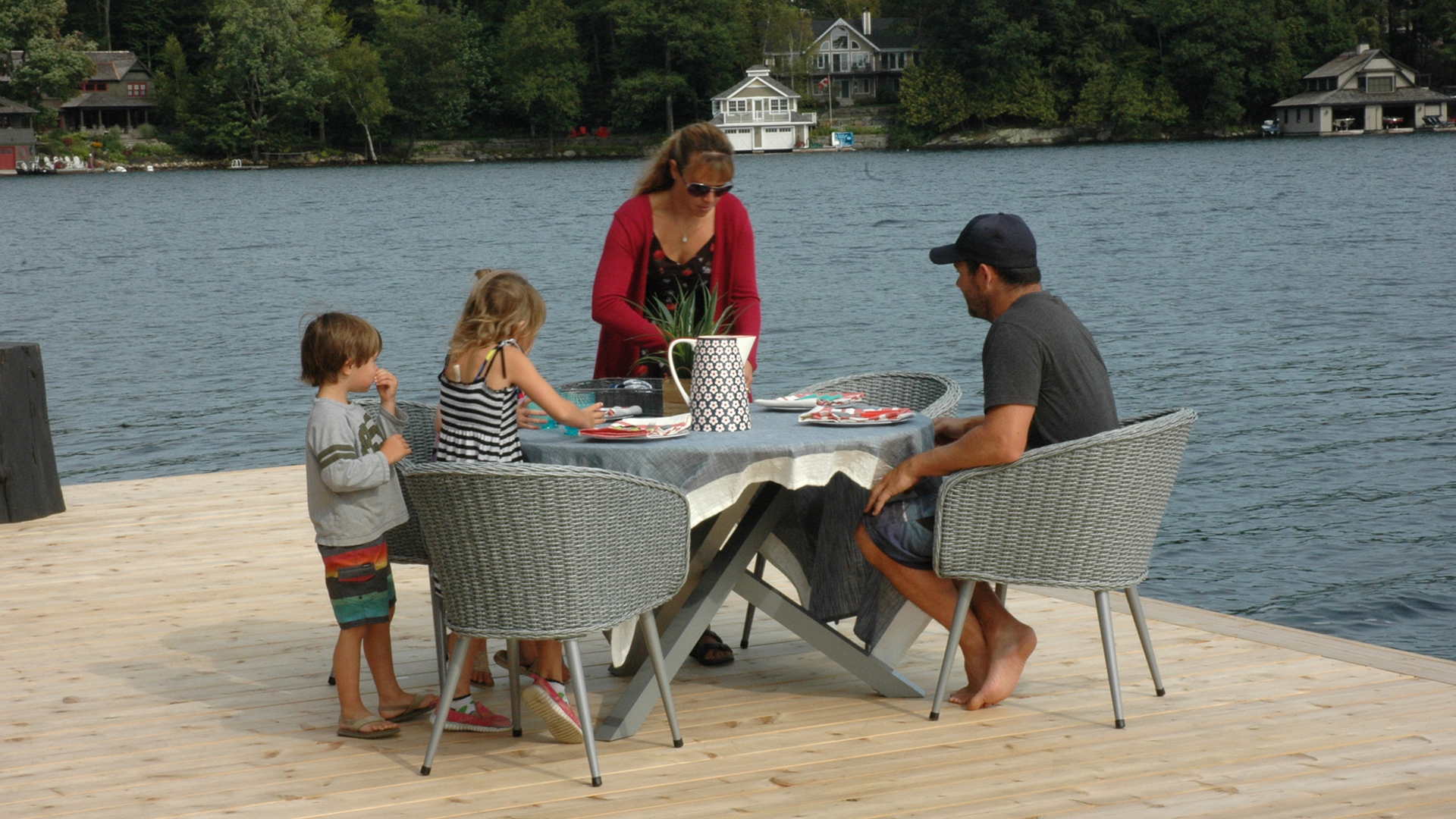 } Card 3. Rantaelämää Description: Clarken perheen mökillä on komea järvimaisema. He toivovat leveämpää ja tilavampaa laituria, jossa on iso terassi ja veneille lisää laituripaikkoja.